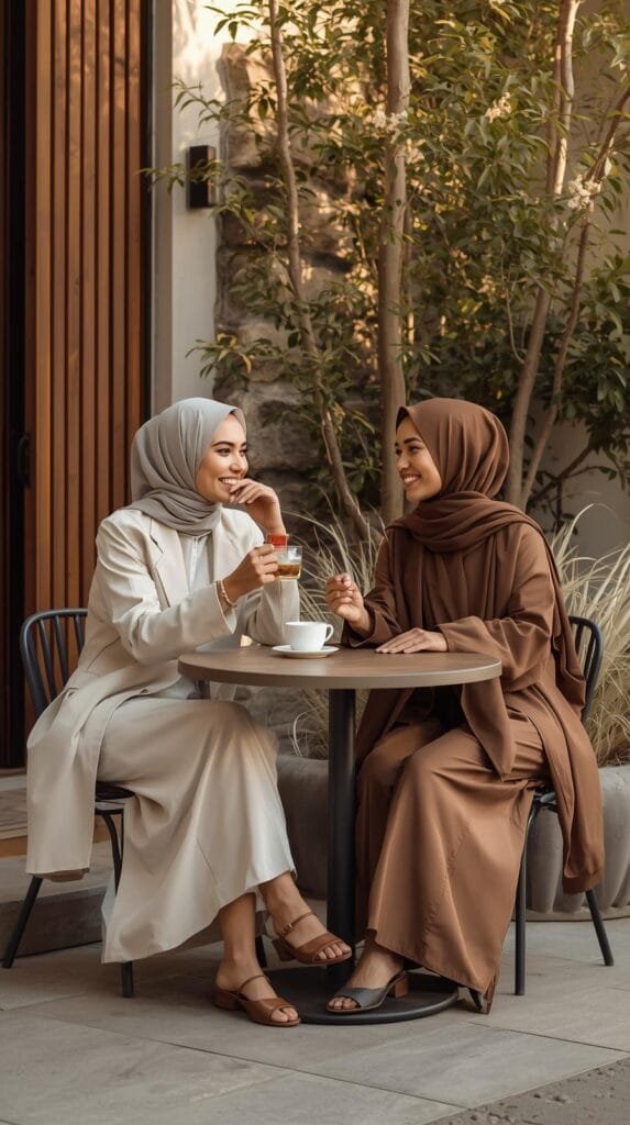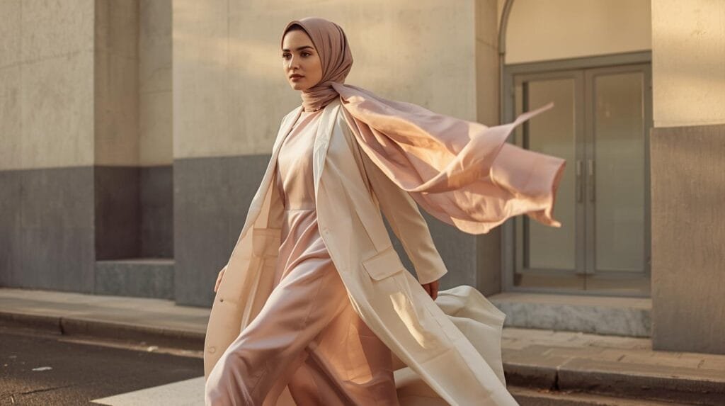 Tren longline mengajarkan bahwa keanggunan sejati lahir dari kesederhanaan. Tak perlu detail berlebihan, cukup garis yang bersih dan jatuh kain yang alami. Siluet panjang yang mengikuti bentuk tubuh tanpa menonjolkan lekuk justru menciptakan aura elegan yang sulit dijelaskan. Ia menutupi, namun juga menegaskan kehadiran dengan lembut—seperti cara angin menyentuh daun tanpa suara, tapi tetap terasa. Warna-warna yang sering muncul dalam tren ini adalah palet alam: ivory, sand, sage green, hingga moka. Warna-warna netral ini membawa ketenangan visual sekaligus kemudahan untuk dipadupadankan. Ketika seorang muslimah mengenakan longline outfit, ada nuansa kedewasaan yang terpancar—bukan karena usia, tapi karena kesadaran akan keseimbangan antara gaya dan makna.