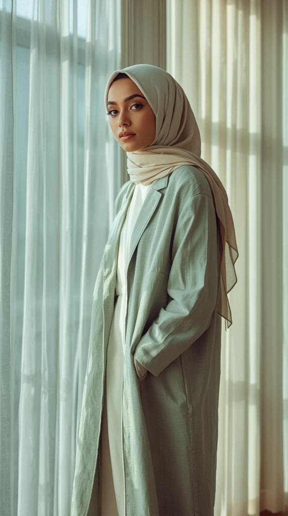 Longline juga membuka ruang eksplorasi tekstur dan lapisan. Outer berbahan linen dapat dipadukan dengan inner satin atau pleated skirt untuk hasil yang dinamis, sementara hijab polos dari bahan voal memberi keseimbangan visual. Keseluruhan tampilan menjadi lembut, mengalir, dan tetap terjaga. Di sinilah harmoni itu hidup—antara gaya dan kenyamanan, antara niat dan ekspresi.
