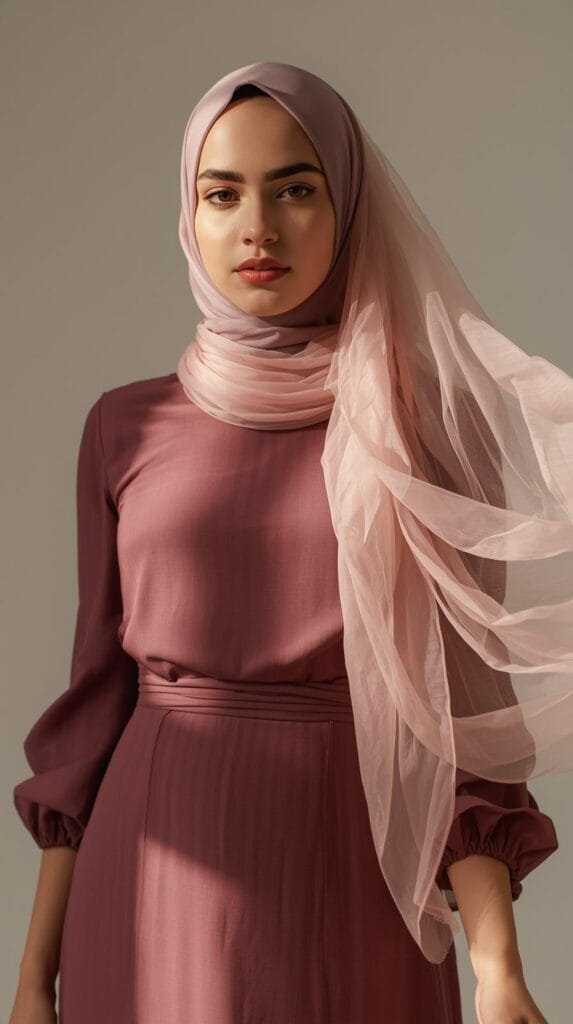 Dalam hijab styling, tekstur ringan membantu menciptakan drape lembut dan jatuhan kain yang natural. Ketika dipadukan, berbagai tekstur halus dapat menciptakan layering tenang yang menambah keanggunan tanpa menambah volume. Tampilan pun terasa bagaikan rangkaian kelopak yang bertumpuk anggun, membangun siluet penuh ketenangan.