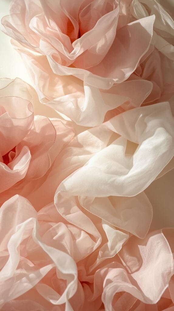Keindahan tekstur airy adalah kemampuannya menangkap cahaya. Lipatan lembut pada chiffon menciptakan bayangan halus yang menyerupai kelopak yang terlipat. Sementara itu, baby crêpe menghadirkan kedalaman mikro yang membuat tampilan lebih hidup. Efeknya adalah visual yang dinamis namun tetap halus.