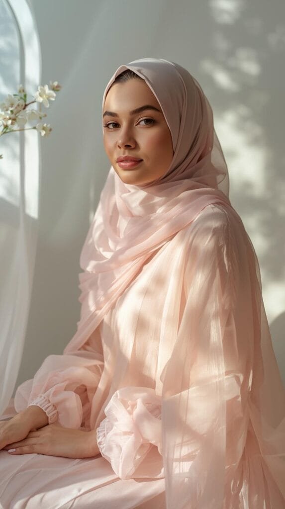 Palet pastel cenderung mudah dipadukan dengan berbagai gaya hijab, terutama ketika dipadukan dengan material airy. Warna lembut mampu meredam kesan berat dan membuat keseluruhan tampilan lebih ringan. Dalam pencahayaan natural, palet ini menciptakan kilau tipis yang menambah atmosfer feminin yang sangat halus.