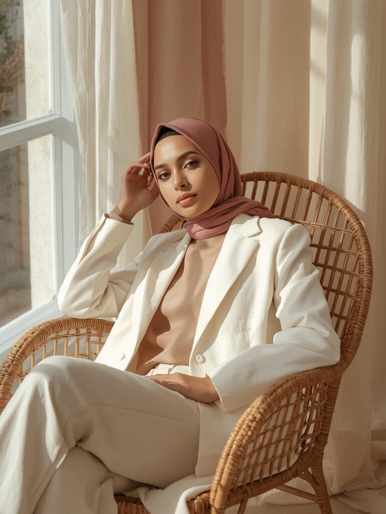 Seperti dua nada yang berbeda, mereka menciptakan irama lembut yang indah.Gaya ini cocok bagi perempuan yang ingin menonjolkan karakter tanpa kehilangan sisi feminin. Misalnya, kombinasi hijab dusty rose dengan outer ivory dan celana wide leg sand beige dapat memunculkan kesan modern dan percaya diri, namun tetap tenang dan bersahaja. Soft contrast bukan sekadar tampilan; ia adalah perwujudan dari keseimbangan antara keberanian dan kelembutan yang hidup berdampingan dalam diri seorang muslimah.