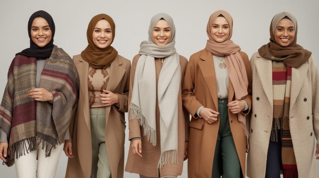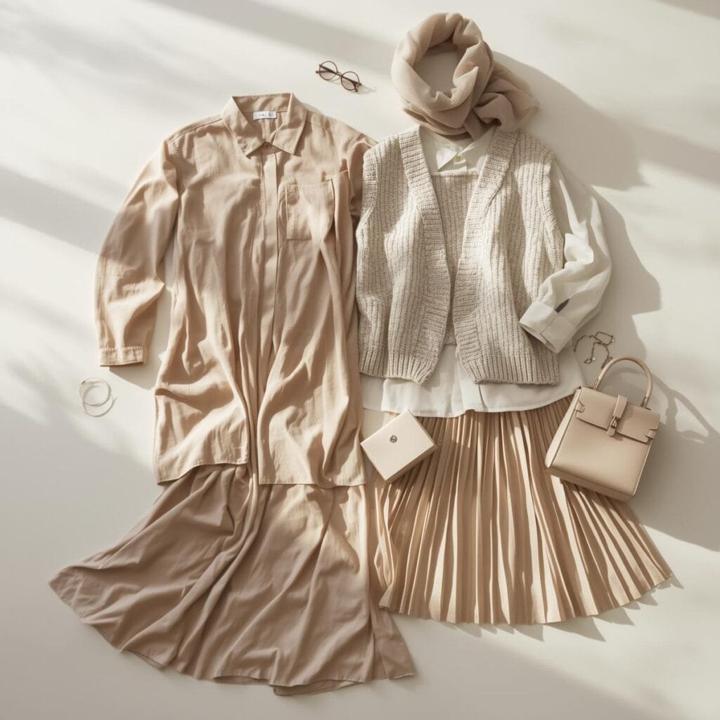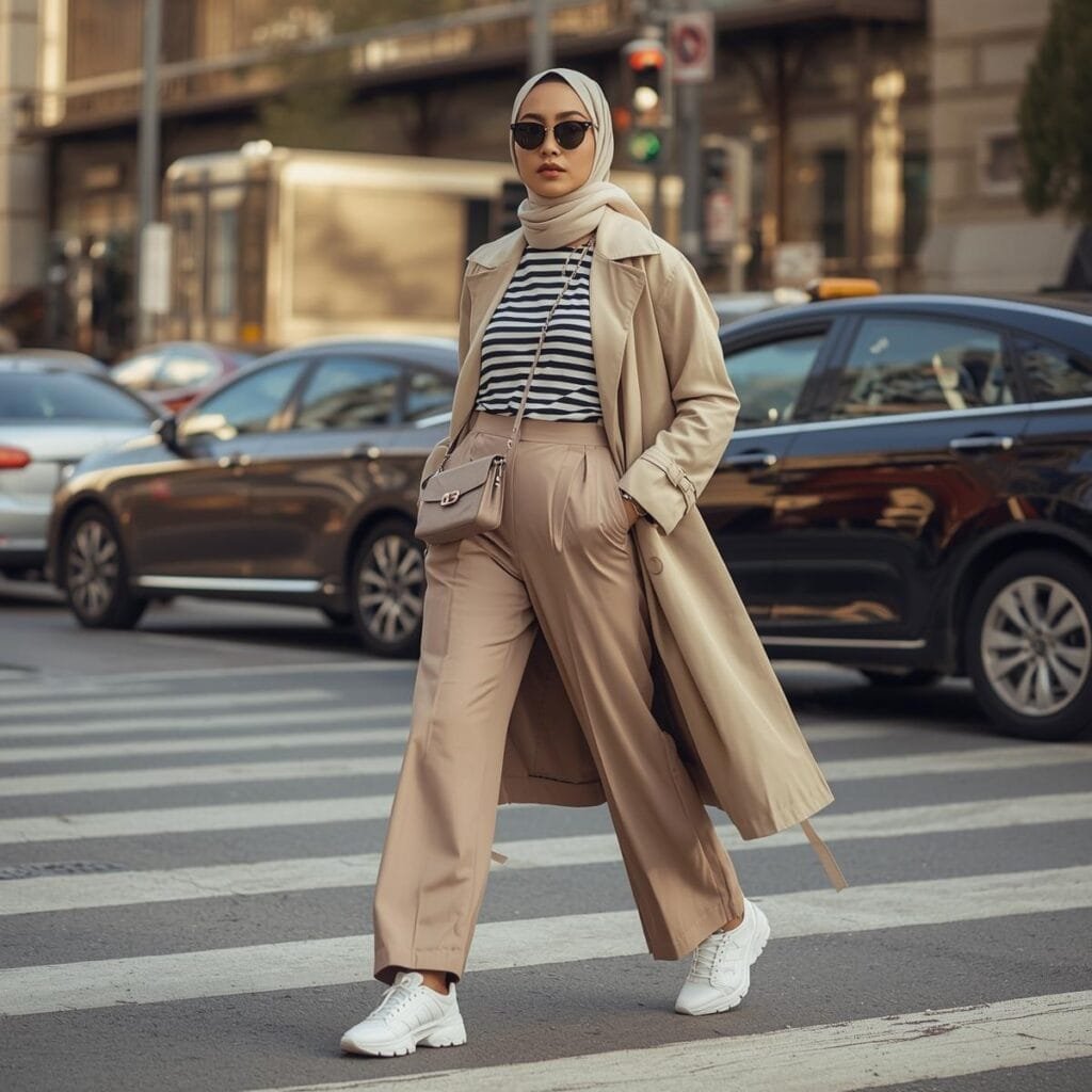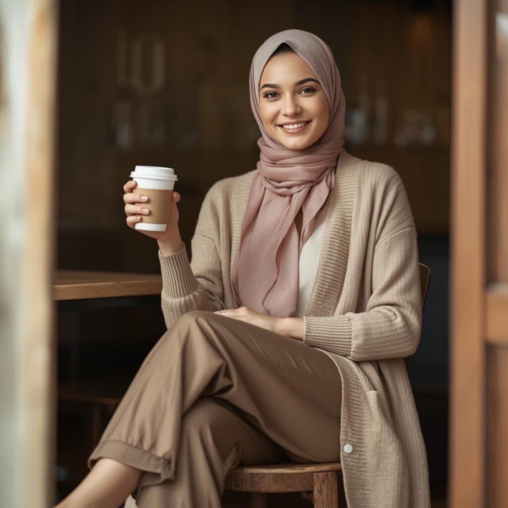 Gaya berlapis (layering) dengan palet netral menciptakan harmoni visual yang menenangkan dan cerdas. Cobalah padukan inner ivory dengan outer linen beige, lalu tambahkan hijab taupe matte untuk sentuhan yang lebih dalam. Kombinasi lembut ini memberi kesan effortlessly chic—anggun tanpa berlebihan.