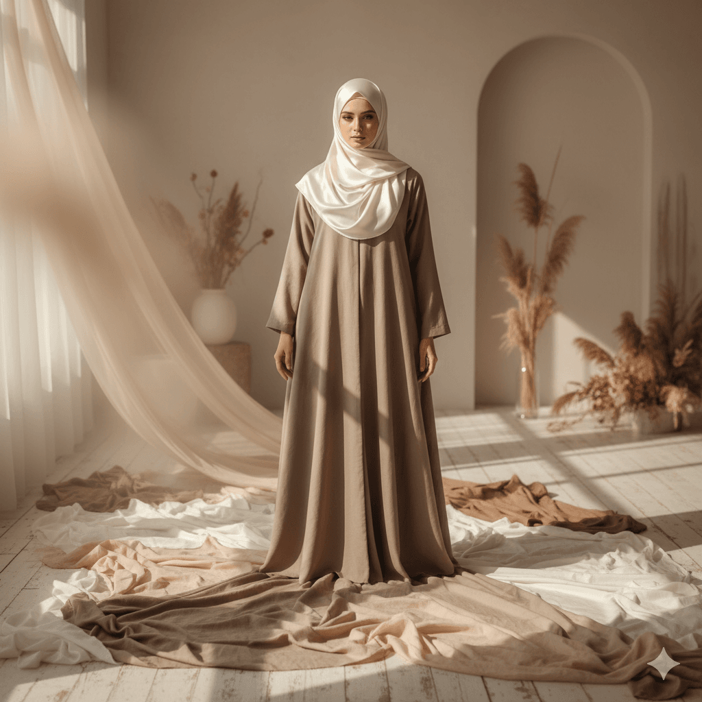 Busana hijab dengan permainan tekstur menghadirkan kesan hidup pada tampilan yang sederhana. Perpaduan bahan seperti linen matte dan chiffon mengalun, atau katun halus dengan detail rajutan ringan, mampu menciptakan harmoni visual yang terasa alami. Dalam kesenyapan kain, ada narasi halus tentang keseimbangan dan keteduhan yang hanya bisa dirasakan, bukan dijelaskan.